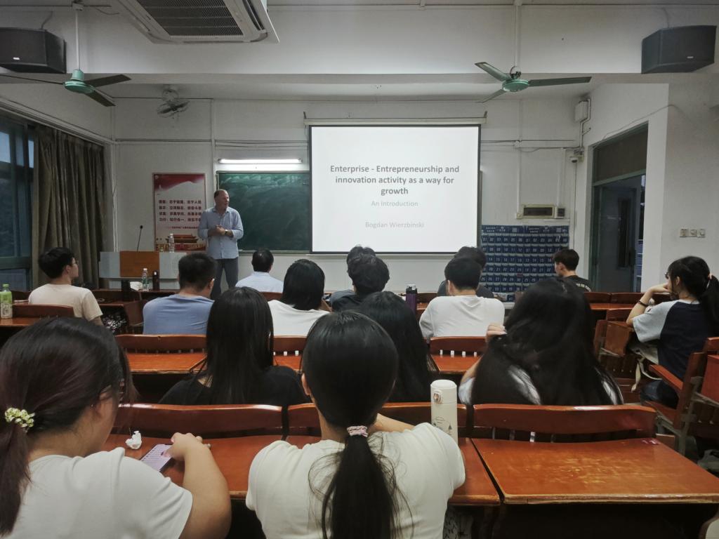 Bogdan教授是热舒夫大学人文学院的副经理,主要从事市场经济等方面的研究。他首先介绍了波兰的经济、地理和人文情况,顺势巧妙地引入了创新和创业的概念,分析了企业在不断变化的市场环境中遇到的问题以及创业活动所提供的机遇,同时与同学们就创业活动如何在这一背景下蓬勃发展进行了探讨。讲座内容丰富,深入浅出,大家听得津津有味,不断提出关心的问题,Bogdan 教授都耐心地作了解答。
